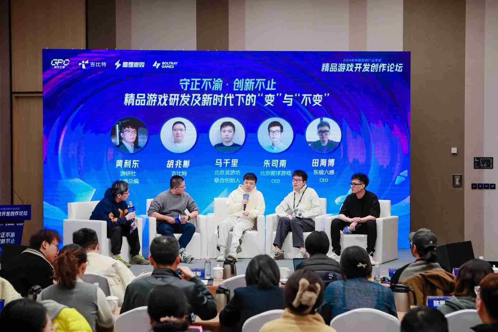 圓桌對話環節,,,,在游研社內容總編黃利東的主持下,,,,一競技CTO胡兆彬、、北京靈游坊聯合創始人馬千里、、北京猩球游戲CEO朱司南、、東極六感CEO田海博等四位嘉賓圍繞“守正不渝、、、、創新不止——精品游戲研發及新時代下的‘變’與‘不變’”這一主題分享了各自在精品游戲開發理念及工程能力搭建方面的見解和經歷,,,,并就行業變化下游戲人需要堅守的理念等展開交流探討。。